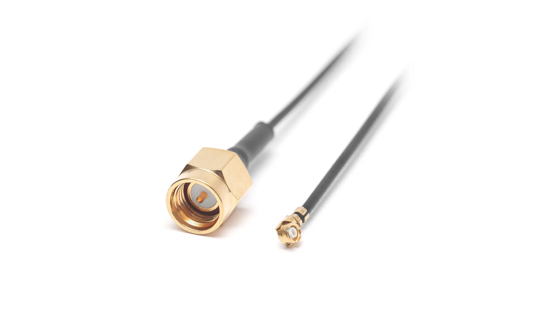 SMA Plug to MHF1 (U.FL) with 100mm cable suitable for connecting an external antenna to a PCB. The antenna is connected to the SMA (Male) and the MHF1 is connected to the PCB.